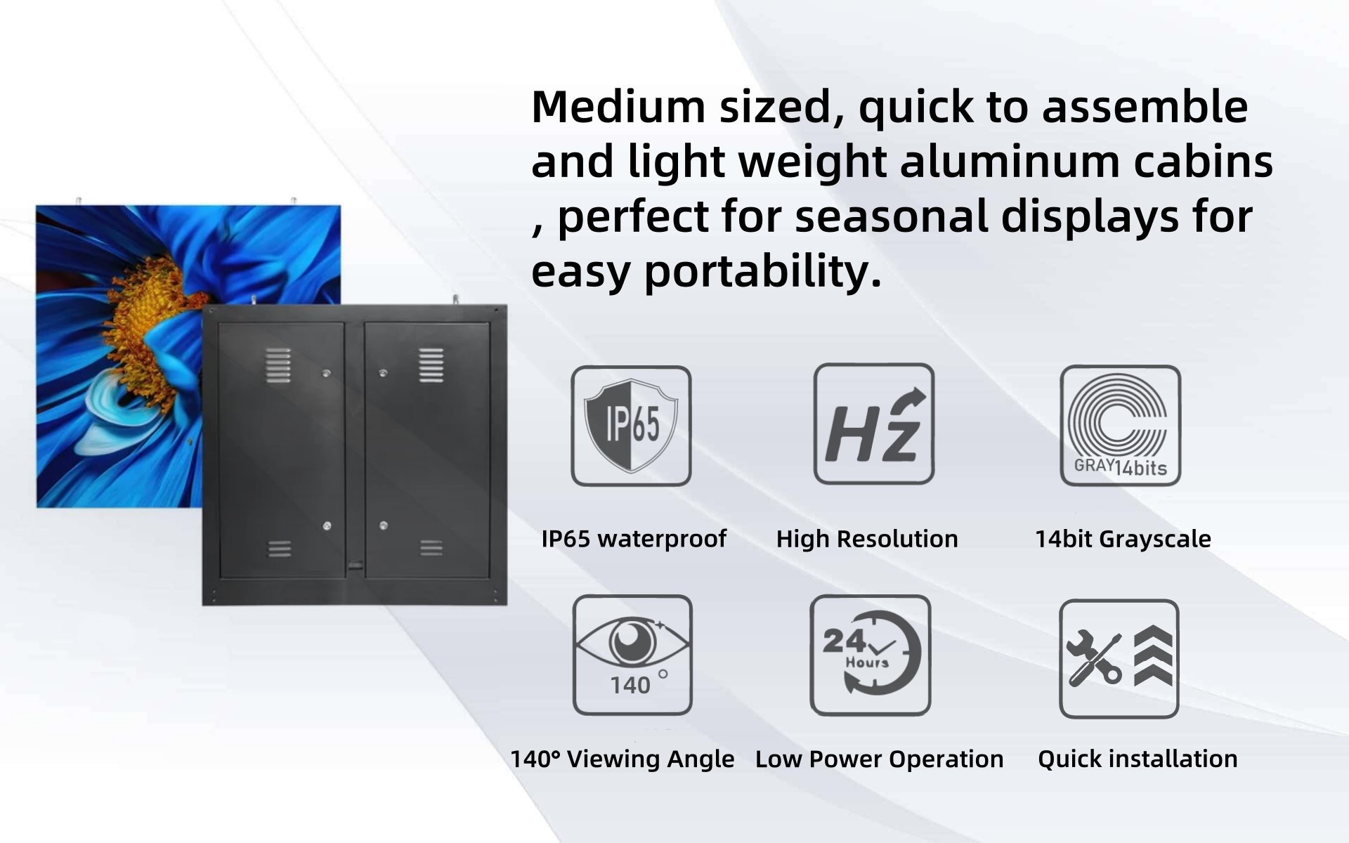 Full fixed outdoor LED display products are lighterin weight, LED display with quick lock function,compact structure, easy to install, no gaps. Theuser-friendly handlebar design makes it easy tomove the cabinet.