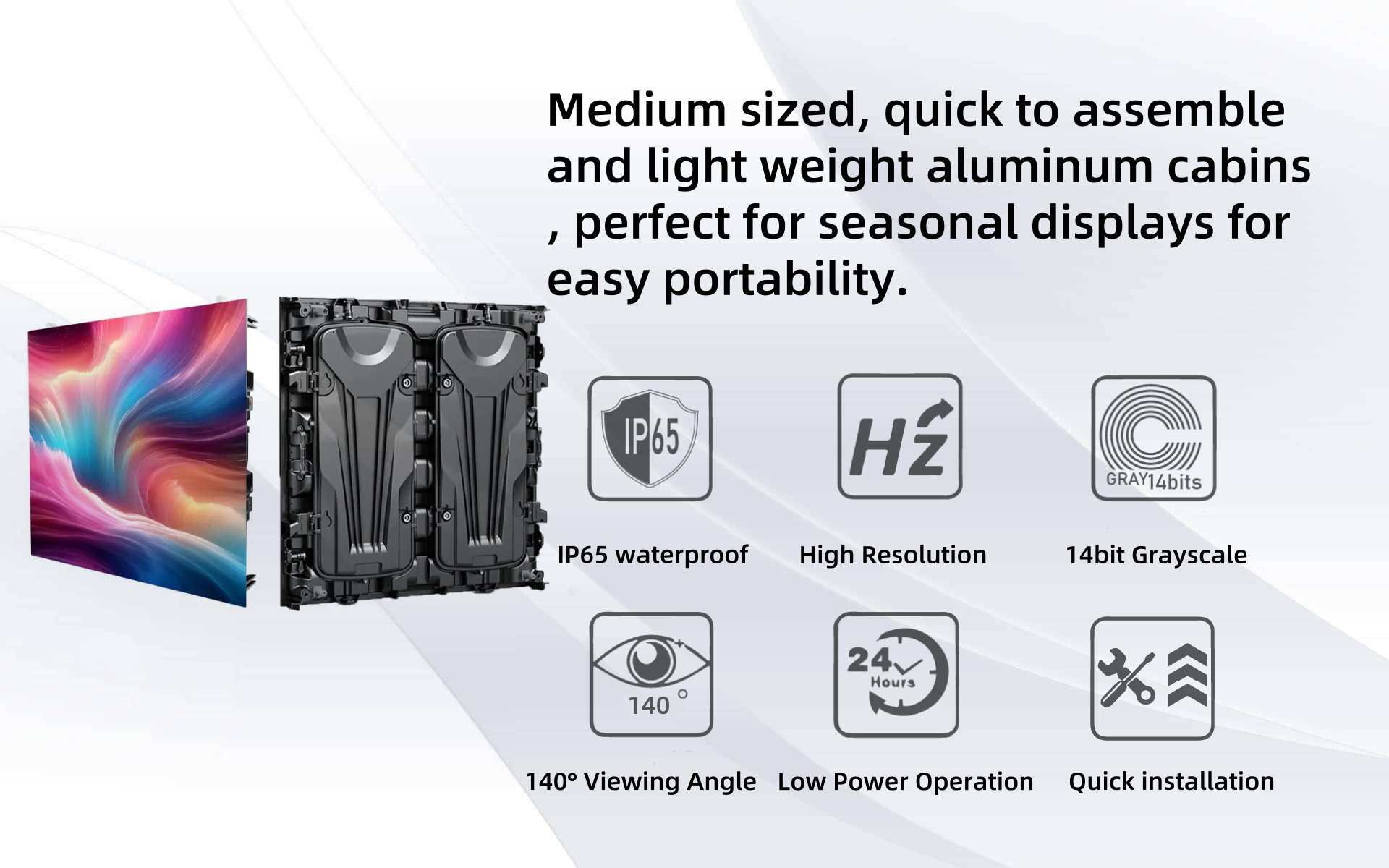 TStandard size series 960x960mm LED display forcabinet with ultra-thin cabinet design, 107mmthickness. Die-cast aluminum cabinet design islight and easy to move, good flatness and smooth.